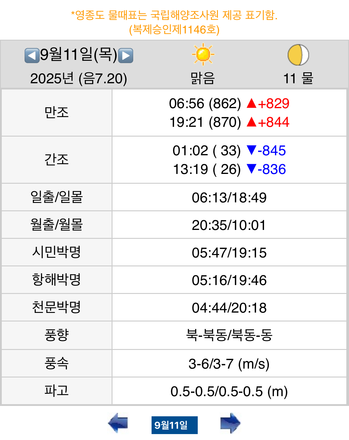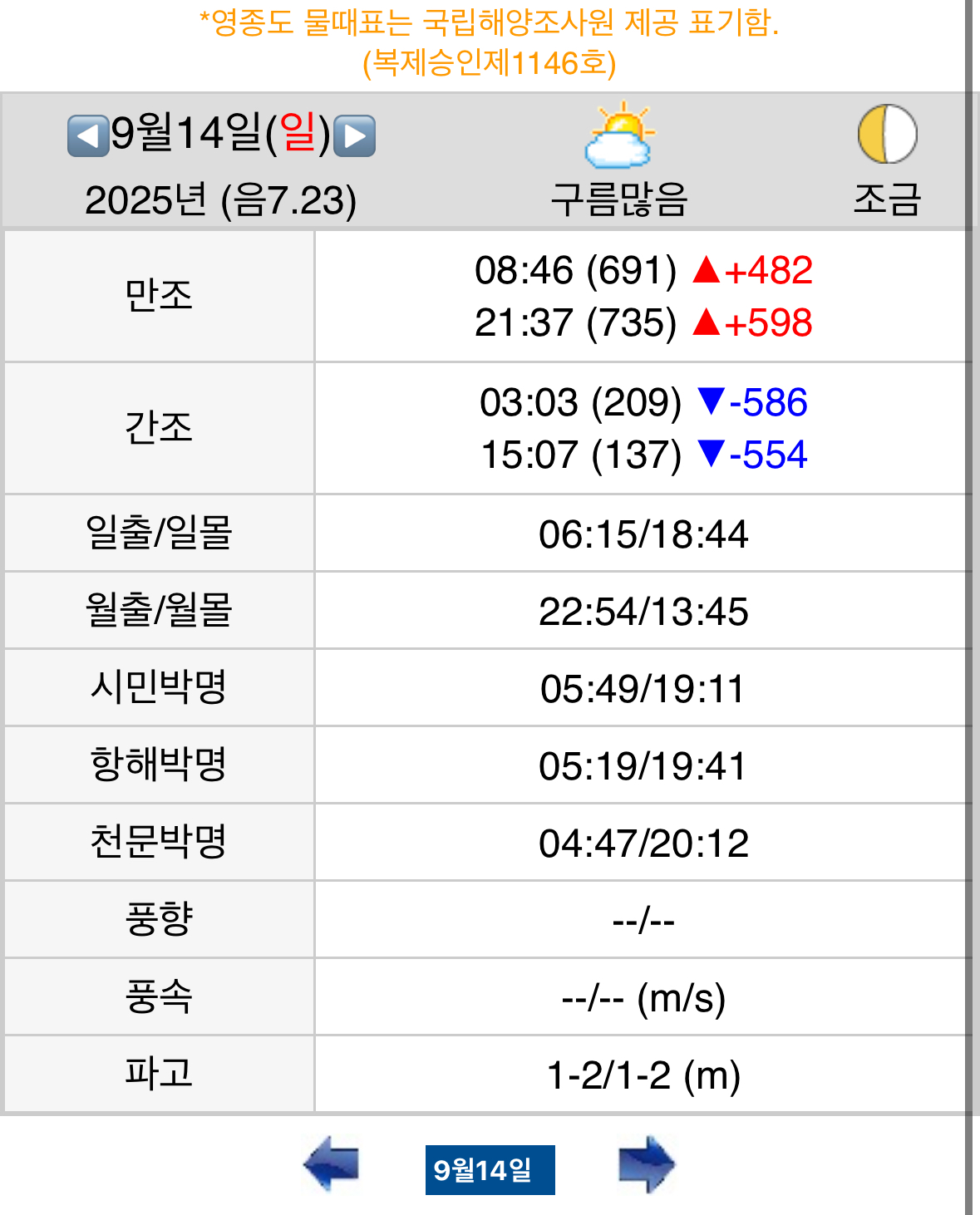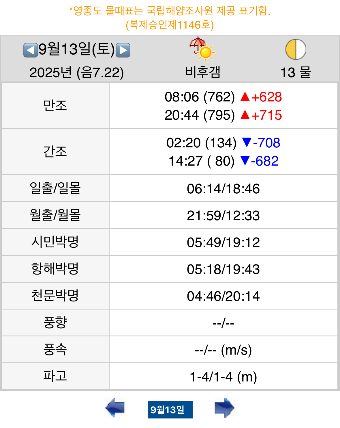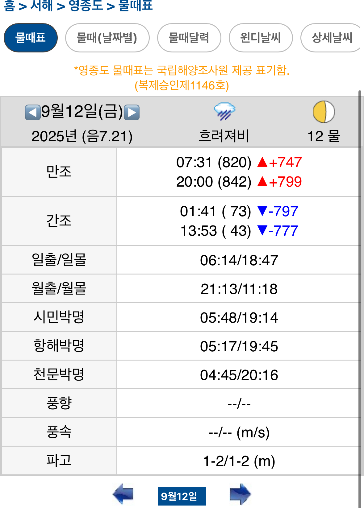 ํด์์์ฐ๋ถ๋ ๊ธฐ์์ฒญ ํด์์ ๋ณด, ๋๋ ๋ฐ๋คํ์๋ท์ปด๊ณผ ๊ฐ์ ์น์ฌ์ดํธ์์ ๋ ์ง๋ณ ์กฐ์ํ(๋ง์กฐยท๊ฐ์กฐ ์๊ฐ ๋ฐ ์์)๋ฅผ ํ์ธํ ์ ์์ต๋๋ค.