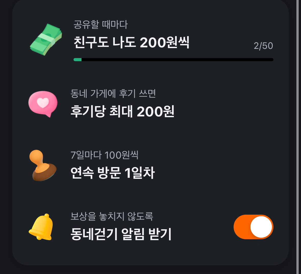 ํ๋ฃจ์ ์ผ์ ๊ฑธ์ ์๋ฅผ ์ฑ์ฐ๋ฉด ๋น๊ทผํฌ์ธํธ๋ฅผ ๋ฐ์ ์ ์๋๋ฐ, ์ด ํฌ์ธํธ๋ ๋น๊ทผ๋ง์ผ์์ ํ๊ธ์ฒ๋ผ ์ฌ์ฉํ ์ ์๋ค๋ ๊ฒ ๊ฐ์ฅ ํฐ ์ฅ์ ์ด์์.